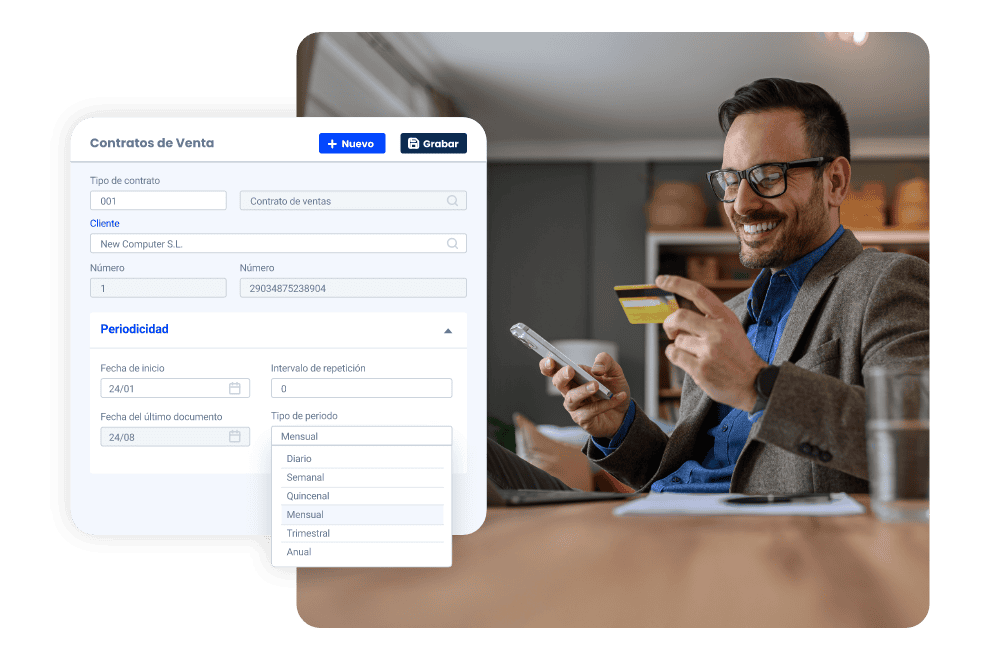 Ponles fácil a tus clientes contratar tu servicio, permitiéndoles hacerlo a través de un abono o suscripción con la periodicidad, alcance y tarifa definida. Así, aseguras la continuidad de tus clientes y una fácil facturación, mediante facturaciones recurrentes asociadas a cada contrato.