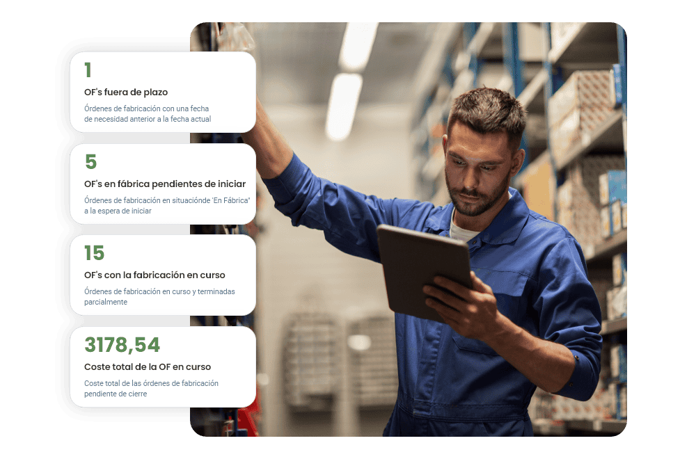 Genera la documentación necesaria (hojas de ruta, lista de materiales, órdenes de trabajo, etc.) a partir de las órdenes de fabricación y recoge las imputaciones directamente en planta o en la oficina, para regularizar automáticamente el almacén y controlar la calidad y los costes.