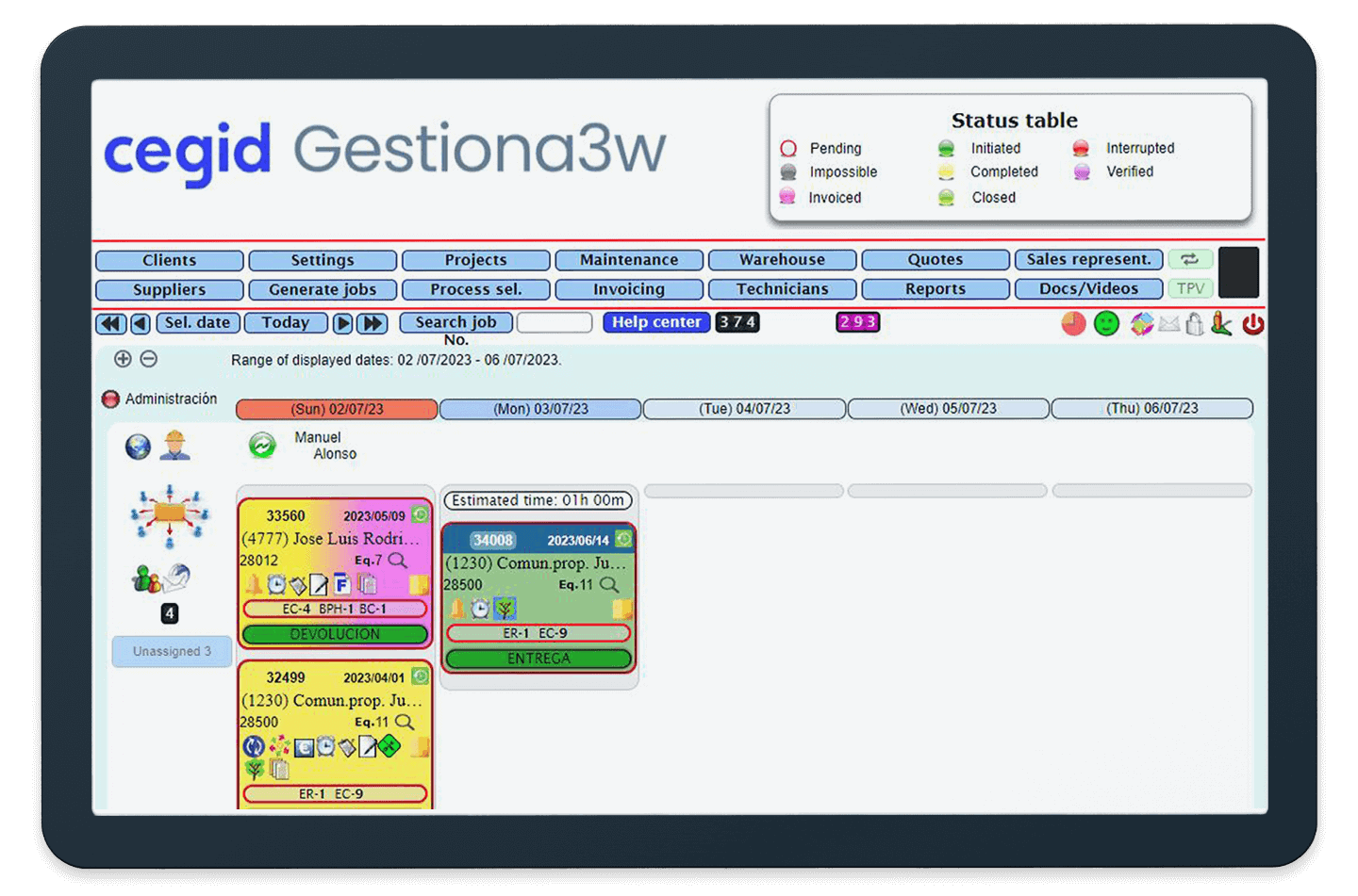 Planifica, asigna y controla todos los trabajos en tiempo real. Con Cegid Gestiona3w puedes visualizar online el estado de cada uno de los trabajos, desde su inicio a la facturación. Igualmente, puedes ver los materiales y los recursos empleados.