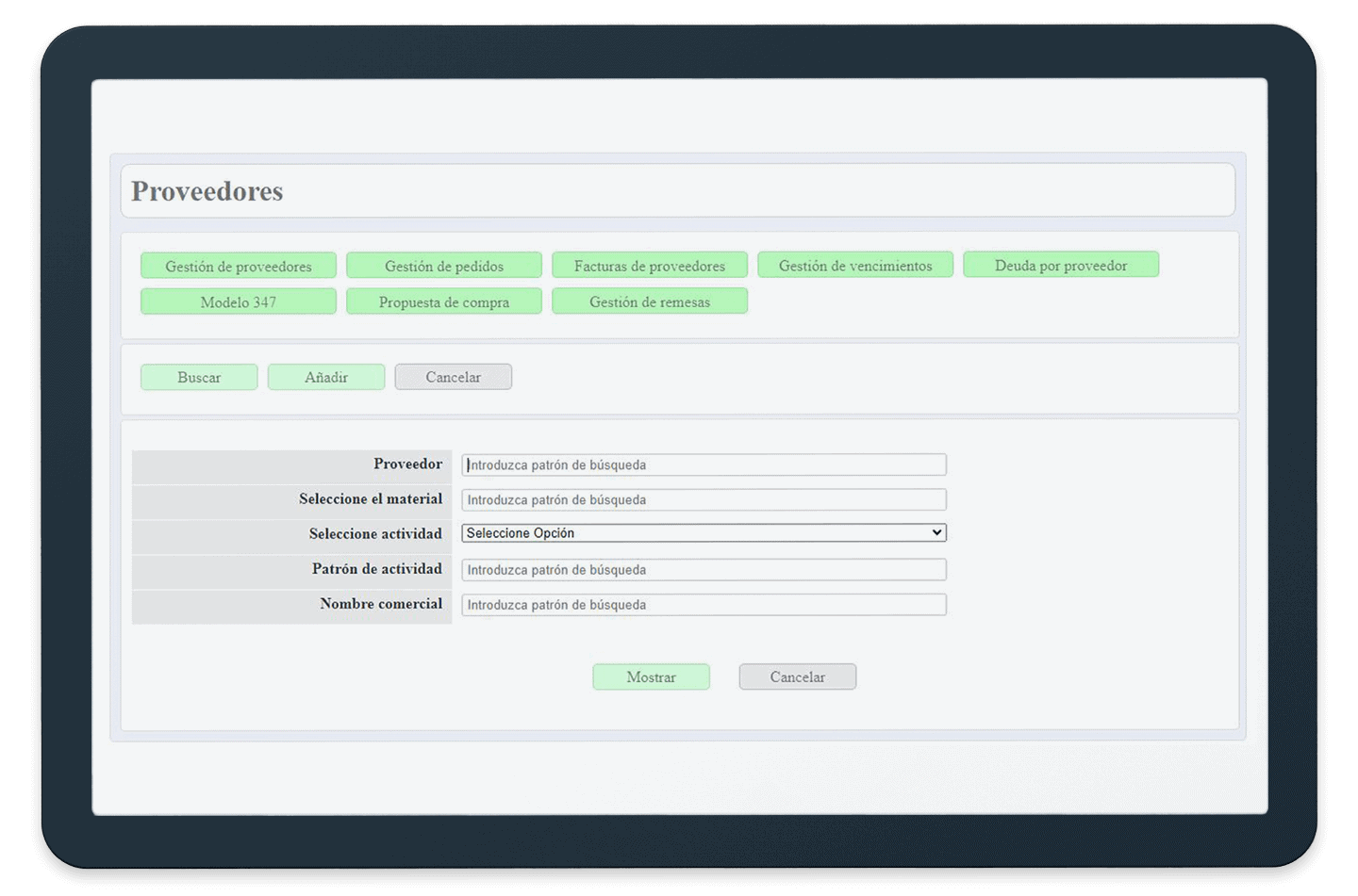 Accede desde la plataforma a tu gestión de proveedores y gestión de pedidos, así como a la gestión de tus comerciales: mantenimiento, comisiones… Igualmente, mantén tu stock controlado en tiempo real con la gestión de almacenes, gestión de materiales, gestión de tarifas.