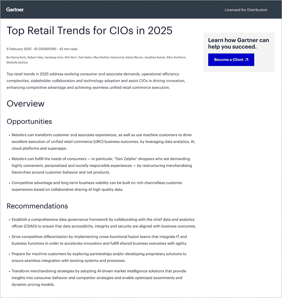 Ottenere il rapportoTop Retail Trends for CIOs in 2025, Gartner