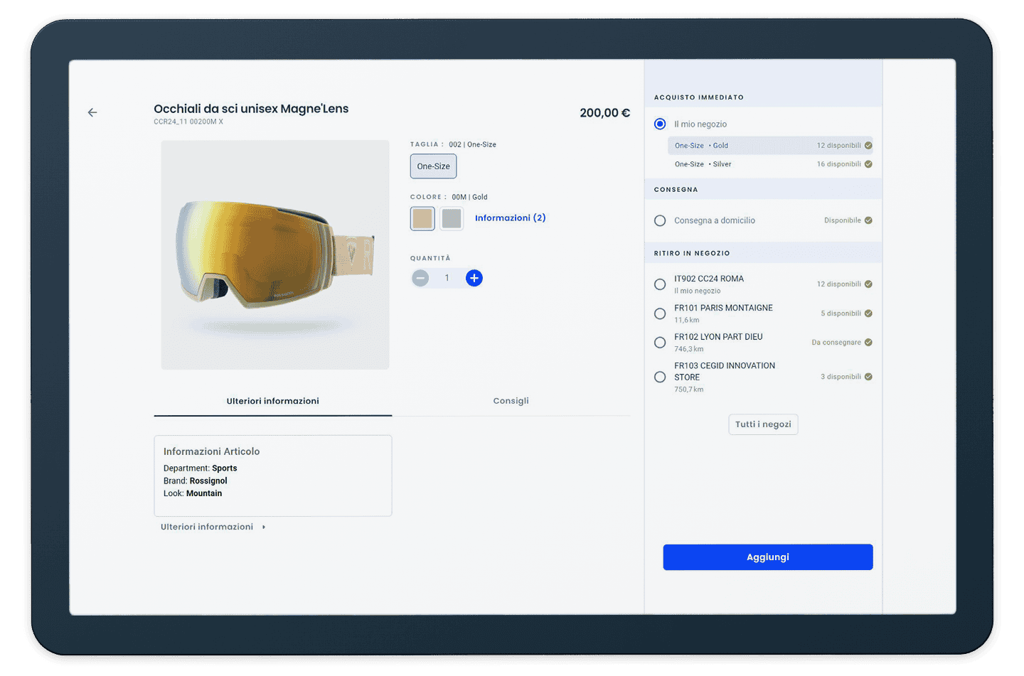 Equipaggiate i vostri team di vendita con le soluzioni Cegid Retail, disponibili su dispositivi fissi e mobili, per offrire un servizio clienti ottimizzato, raccomandazioni pertinenti basate sulla disponibilità dei prodotti e tutti i servizi omnichannel. È inoltre possibile semplificare le operazioni di vendita, incasso, pagamento, inventario, prelievo e consegna.