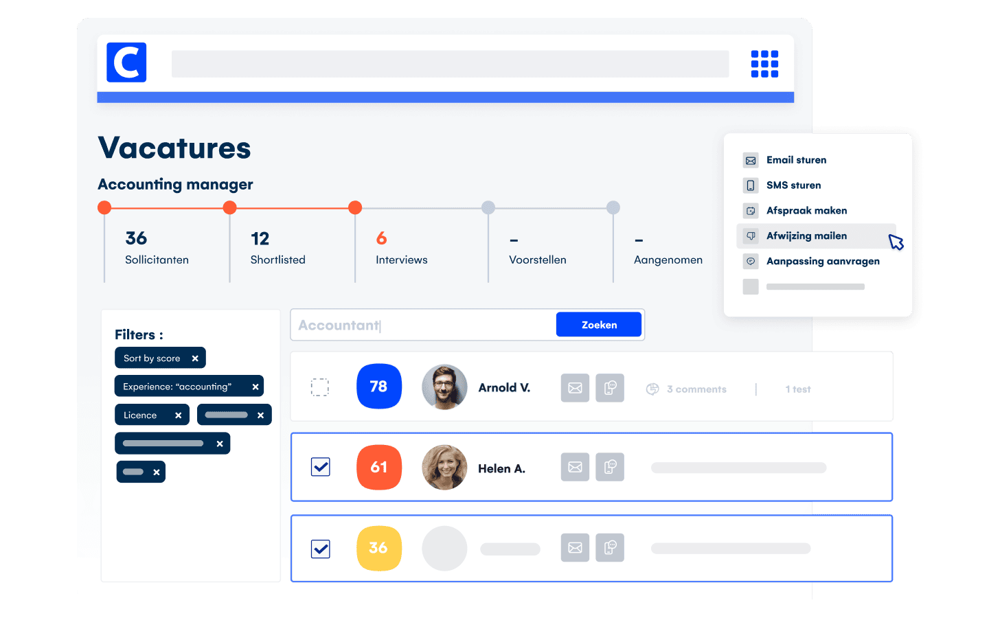 Onze uitgebreide reeks tools vererenvoudigen je werkzaamheden rond het selecteren en verder informeren van kandidaten. Dat bespaart je uiteraard veel tijd. Automatische cv-parsing, vragenlijsten, integratie van scorecards en beoordelingen, maar ook massamails en sms-berichten met persoonlijke aanhef: al je filters en acties met één klik onder handbereik!